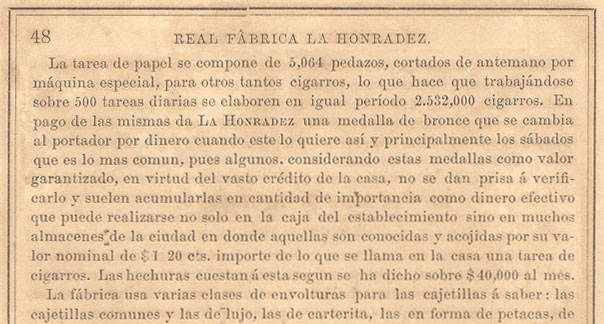 Pues bien, en el referido artículo cuya imagen adjuntamos a continuación, nos dan la explicación de cómo dicho trabajo de confección de cigarrillos era pagado mediante un método de vinculación del pago con el trabajo realizado mediante dichas medallas, las cuales tenían poder liberatorio incluso en diversas tiendas de la ciudad.