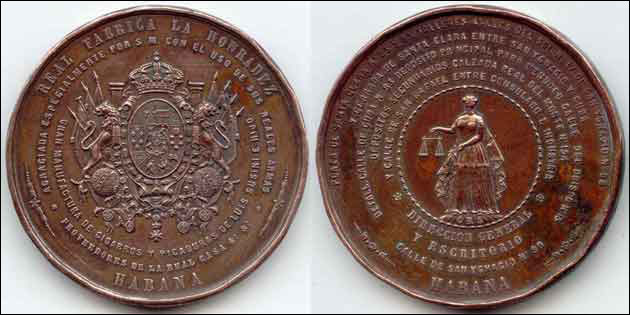 Esta magnífica pieza fue acuñada en cobre, con un diámetro de 23 milímetros y cómo podemos ver ostenta el mismo escudo o emblema que usó la fábrica en todas sus envolturas (marquillas) durante muchos años.
