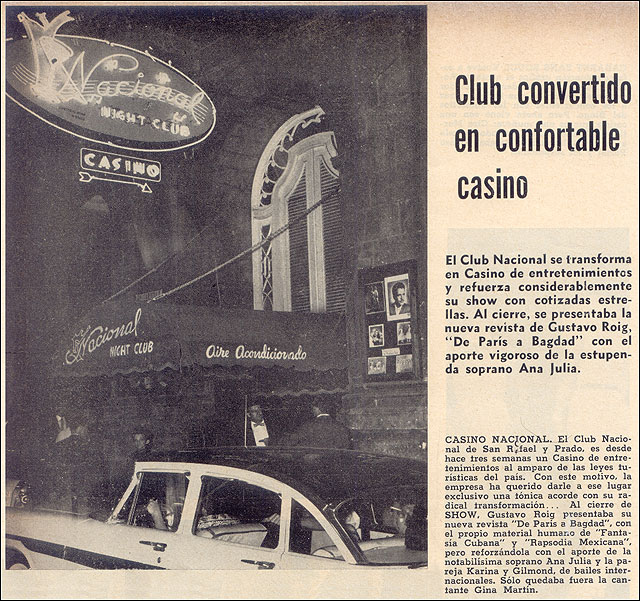 Iniciamos esta estampa con la imagen de un artículo perteneciente a la Revista “Show” del mes de Diciembre de 1957 donde se da cuenta de la transformación sufrida por el Cabaret Nacional con el objeto de incluir dentro de sus atracciones un casino de juego amparado por las nuevas regulaciones dictadas por el Ministerio del Turismo.