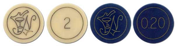 Para ello lógicamente emitió una serie de fichas que siguieron el molde de las emitidas de forma precipitada por varios casinos cubanos durante ese año (Copacabana de Camaguey, Tropical, Tropicana, etc). Estas eran un poco mayores que las comunes (1.6 pulgadas de diámetro) construidas de plástico liso con la inscripción de valor incusa. Ya con autorización para el juego las fichas tenían valores y estaban claramente identificadas por el mismo símbolo o logotipo que usaba el centro en sus diferentes propagandas (con una copa sobre un tronco de árbol que remedaba una letra C).