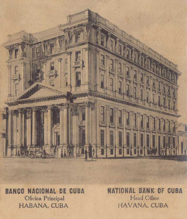 En 1906 el Banco Nacional de Cuba inauguró su nuevo edificio, situado en la esquina de las calles Obispo y Cuba, con una superficie de 2 500 metros cuadrados. Este fue el primer edificio de La Habana construido especialmente para el tipo de actividad mercantil a que fue destinado. La dirección técnica de la obra estuvo a cargo del ingeniero Francisco Toraya, y la construcción fue realizada por la firma Purdy & Henderson, de Nueva York. Allí radicó la entidad hasta su liquidación en 1921.