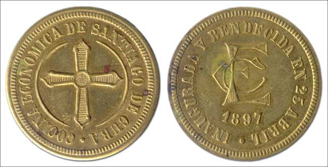 Anverso: Cruz de Santiago. COCINA ECONOMICA DE SANTIAGO DE CUBA. 1897.