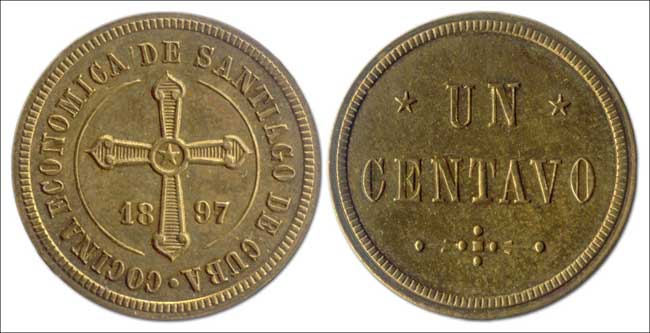 Esta pieza se menciona en el catálogo preparado por Alfredo Díaz Gámez, quien durante muchos años trabajo en el Museo Numismático e hizo un estudio muy serio y acucioso al respecto. Sin embargo nunca la hemos visto, ni físicamente ni en imagen alguna. No sabemos de qué colección o publicación obtuvo Alfredo la información sobre la existencia de esta pieza que sería una de las más raras de la colección cubana. En realidad nos llama la atención que sea de zinc y su valor de 5 centavos, muy alto para aquellos tiempos de penuria. Si un día aparece debe ser en el mismo Santiago de Cuba, así que si alguien de por allá la conoce o posee le rogamos nos contacte para aclarando su procedencia incorporar su imagen a esta página. Se lo agradeceríamos.