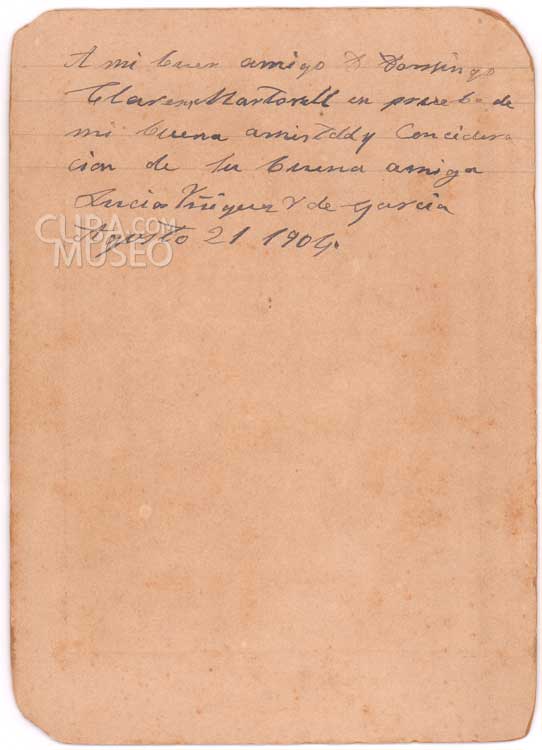 Tal vez esta fue una de las pocas fotos que Lucia se hizo en su vida porque no era ella mujer de vanagloria o grandes recursos. Es importante significar que estamos ante un original – que no deben de haber sido muchos – y además con una interesante dedicatoria al dorso, escrita con mano vacilante poco tiempo antes de su fallecimiento. En esa época las fotos se tomaban generalmente para eso, para dedicársela a amistades cercanas o familiares queridos. Y dependiendo de su economía era la cantidad que cada persona encargaba al estudio donde se la hacían.