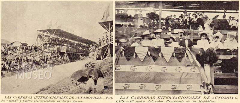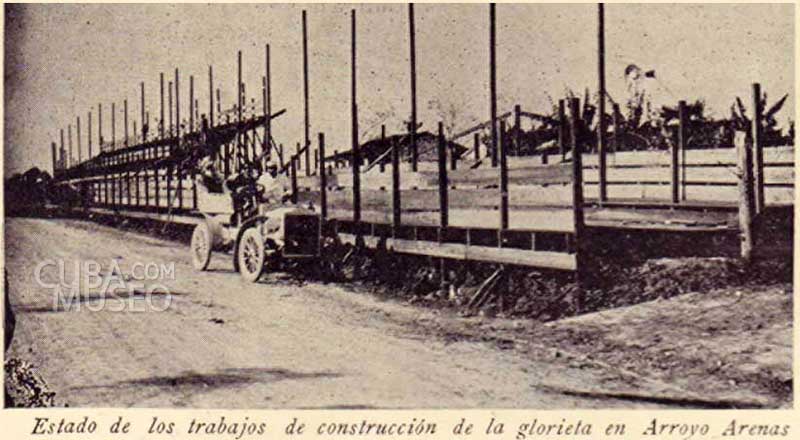 Con ese motivo, la Habana se ha auto movilizado; y unos en el rico y extravagante automóvil, otros en el fastuoso mail coach, o en el grave y airoso vis-avis, y muchos en el democrático familiar y aun en el popular pesetero, buscan el modo de ir hasta el oscuro pueblo de Arroyo Arenas, lugar en donde comenzaran las carreras. Alii encontraran la elegante y esplendida glorieta que ha construido la “Asociación de Carreras Internacionales de Automóviles” y desde donde podrá el gran mundo presenciar las carreras, es decir, desde alii se verán partir las máquinas y después esperar.... para verlas venir. Para llenar el intermedio habrá carreras de bicicletas.