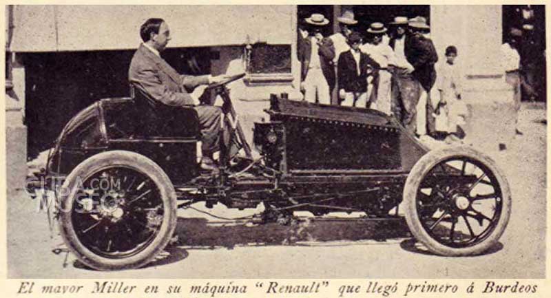 Entre las maquinas que han de tomar parte, figura, en primera línea, ya que no por su tamaño y potencia, al menos por su historia y velocidad, el afamado Renault de 30 caballos, propiedad del Mayor Miller y el cual (siendo entonces del señor W. Gould Brokan) fue el vencedor en las carreras Paris- Bordeaux-Madrid, llegando el primero a Bordeaux en cuyo punto fueron suspendidas las carreras por orden de las autoridades, en vista de los percances que ocurrieron. Este aparato será conducido hasta la mitad de la carrera por su propietario Mr. Miller, y por su chauffeur Mr. Joseph Tracey, la otra mitad.