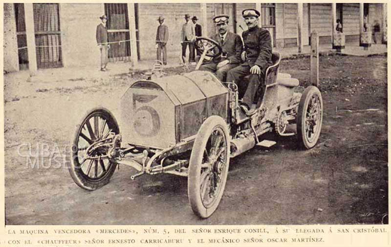 Hasta aquí lo que nos cuenta el papel de una carrera que como podremos ver en las imágenes de la galería fue un éxito, un espectáculo muy diferente a los actuales (que son elitistas y bien complicados con sus velocidades de vértigo, sus cambios de neumáticos y sus muchas reglas) en el cual todos disfrutaron de lo lindo, los ricos desde las gradas y los pobres desde las cunetas, viendo los novedosos aparatos rodantes pasar veloces a unos pocos metros de distancia. Es interesante que si sacamos cuentas la velocidad veremos como la del auto ganador (100 millas - 160 Km aprox. - en 1 hora y 50 minutos = 87 Km/h) no fue poca para un trayecto tan accidentado e irregular. Otra de las virtudes de la justa fue la ausencia de algún accidente que enturbiara la alegría por el triunfo cubano pues por esa época comenzaban a abundar los accidentes mortales en ese tipo de justa.