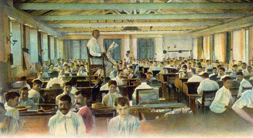 Este hecho, revelador en sí de energías y de una aspiración tan sensata como sentida, hija de la reflexión y del deseo de mejorar, moral y materialmente, innato en todo ser civilizado, se debe precisamente no a que el tabaquero fuese un obrero de inteligencia superior a la de sus compañeros de lucha, sino a la forma especial en que realiza su labor. Como es bien sabido, existen en las tabaquerías vastos salones donde se congregan los torcedores a trabajar, sentados unos al lado de los otros, en sendos taburetes de cuero, ante sus respectivas mesas, cierto número de las cuales - de cinco a nueve por lo general - unidas entre sí lateralmente, forman lo que en términos de tabaquería se denomina un vapor.