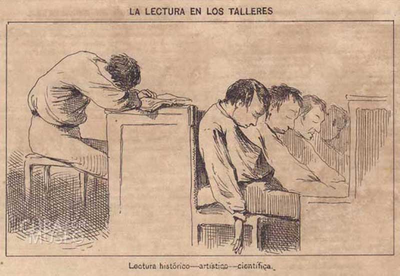 L-04----Caricatura: La Lectura en los Talleres – Lectura histórico-artística-científica