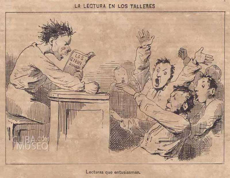 Los fabricantes, cuyo Gremio había quedado constituido en el mes de agosto del año últimamente citado, se mostraban reacios a conceder la autorización para que volviera a leerse en sus respectivos talleres. Por varios meses gozó "La Intimidad” del honroso privilegio de ser la única tabaquería cuyos operarios disfrutaban de los servicios de un lector. En 1882, José González Aguirre, uno de los líderes que conjuntamente con Saturnino Martínez y otros figuraba al frente del sector obrero tabacalero, logró que se permitiera la lectura en la fábrica "Partagás”. Las controversias de orden ideológico, que llegaron a poner en grave peligro de desaparecer a la entidad proletaria fundada un lustro antes, fueron en gran parte responsables de la lentitud con que iba reapareciendo la lectura en las galeras, pero cuando en 1884 resurgió, más vigorosa que nunca, la organización de los trabajadores del ramo del tabaco, dirigidos ahora por Sabino Muñiz, las tribunas tornaron a levantarse en la totalidad de las fábricas de tabacos. Fué justamente por esos días cuando se inició entre el proletariado de Cuba la propaganda del credo anarquista gracias a la difusión prestada, muy especialmente por los lectores de las tabaquerías, a los folletos escritos por José Llunás , revolucionario catalán, a los que siguieron las obras de Kropotkine, Proudhon, Bakounine y otros no menos conspicuos defensores de las ideas ácratas que tan hondamente hubieron de influir en la actuación de los organismos obreros cubanos al través de las dos postreras décadas del siglo XIX.