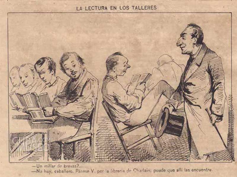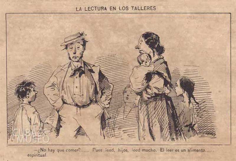 L-07----Caricatura: La Lectura en los Talleres – ¿No hay que comer? … Pues hijos leed mucho