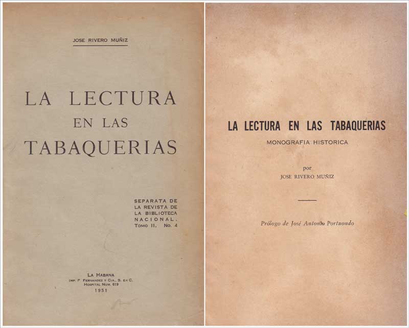 Por sus peculiares características, el tema de la lectura en las tabaquerías es apasionante para todos los que nos interesamos en la historia de la industria tabacalera en Cuba. Por ello fue grande nuestro regocijo cuando hallamos la publicación que motiva esta página. Se trata de un folleto de 22 páginas publicado en 1951 dentro de una separata de la biblioteca nacional: “La Lectura en las Tabaquerías”, Monografía Histórica por José Rivero Muñiz.