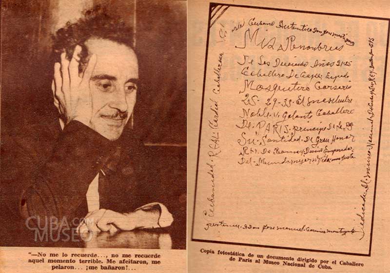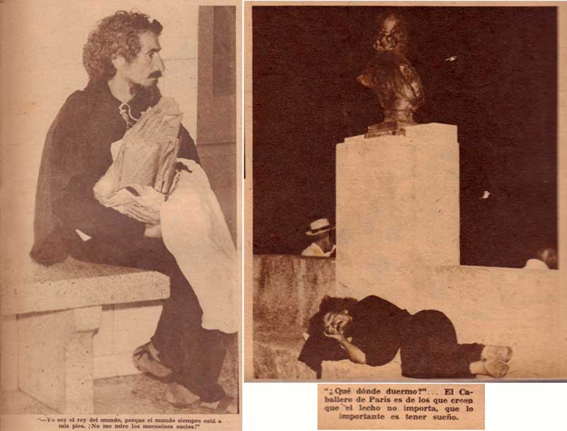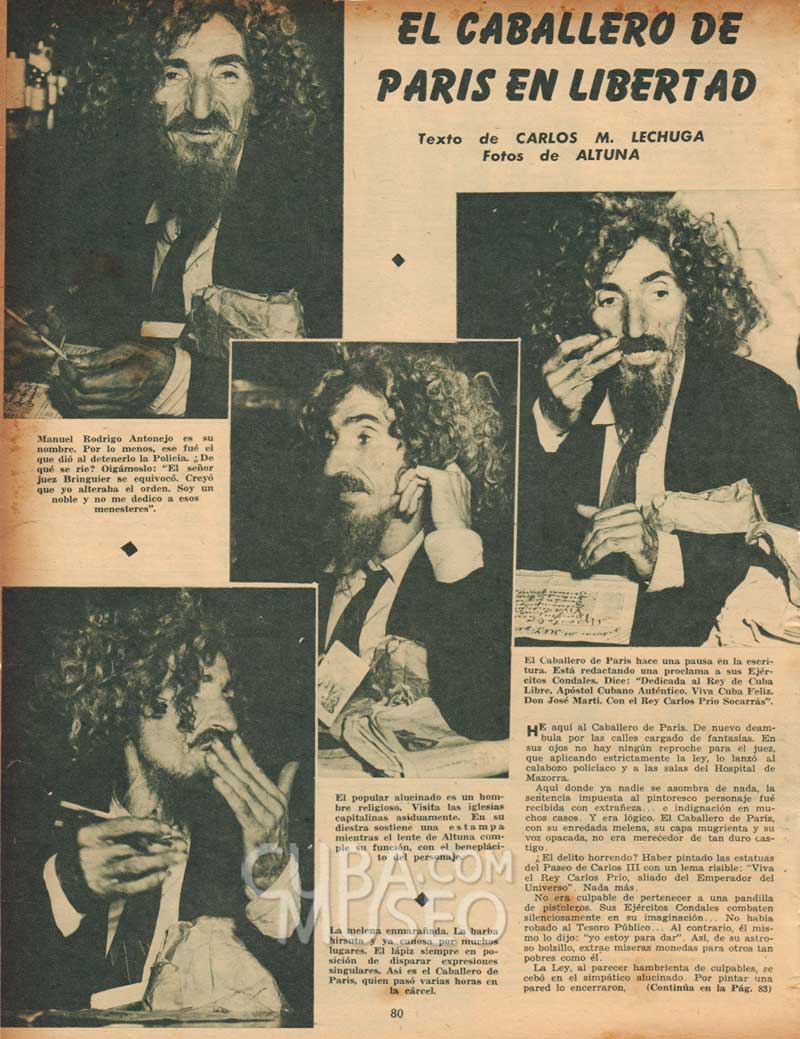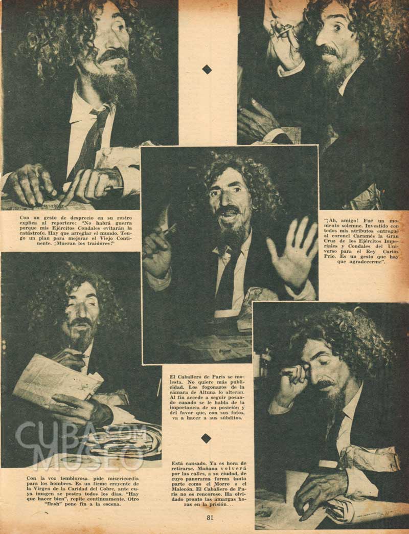 El "Caballero de París" es una de las figuras más populacheras de La Habana. Su estampa absurda y mugrienta, recorre a diario calles y paseos. Sus largos cabellos y sus desordenadas barbas son cotidianamente la sorpresa y la burla de grandes y chicos. Y esa su simbólica capa negruzca y mugrienta, cuando es batida por la brisa del Golfo, le da a su humanidad un sombrío aire fantasmagórico. ¿Es un loco el Caballero de París? ¿Es un trastornado mental el hombre que así se presenta a la mirada y la crítica de los habaneros? Hay quienes dicen que sí... Pero hay quienes afirman que ese hombre no es un loco, sino un ser astuto que ha descubierto una estupenda manera de vivir sin trabajar. Sea lo uno como lo otro, importaba al periodista acercarse a él para tratar de conocer su historia, descubrir facetas de su vida y darle al lector de BOHEMIA un buen material para el análisis. Eso es lo que hemos hecho.