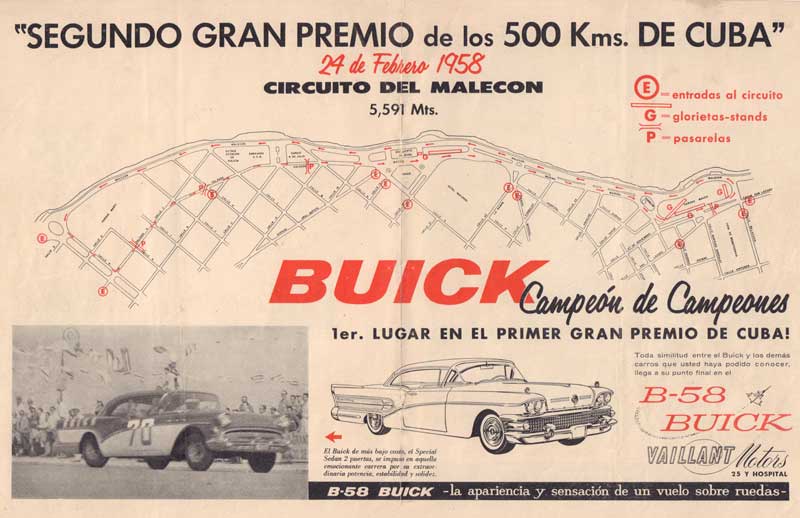 Sin embargo lo que de verdad necesitaba una carrera de ese tipo, con autos que ya en aquellos tiempos desarrollaban velocidades considerables era una pista adecuada. El circuito como podremos ver en esta propaganda de la marca Buick utilizaba el hermoso malecón habanero con 5591 metros productos de la ida y vuelta desde el Parque Maceo hasta la calle G. Nada que ver con los tramos, curvas, peraltes y gradas para el público usuales de un evento de ese género. Todo ello dio lugar al accidente en cuestión.