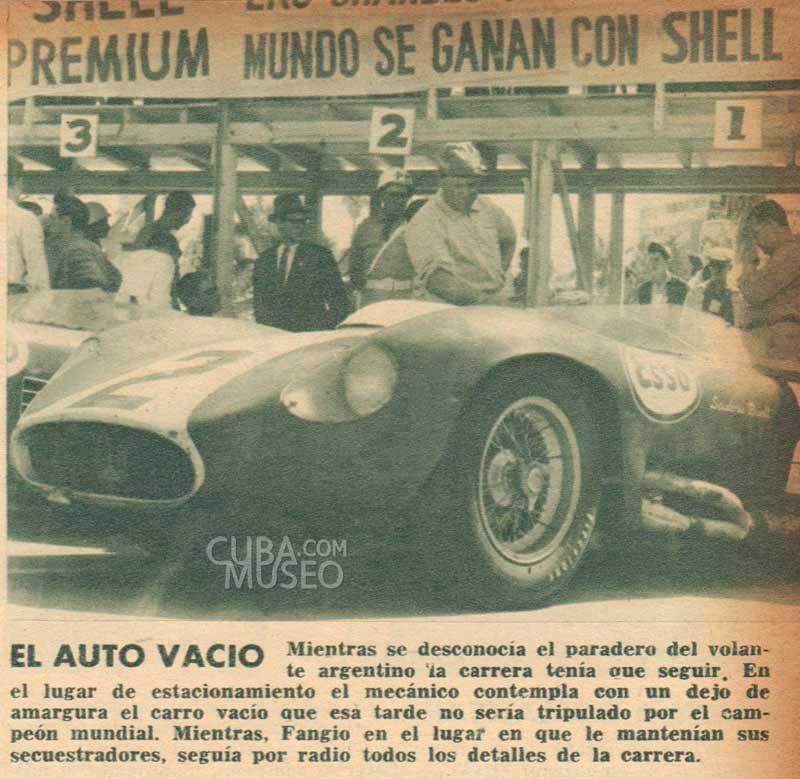 —Habla el 26 de Julio... Tenemos secuestrado a Fangio... No se alarmen, no hay peligro para su persona Seguiremos informando… De modo imprevisto, los sensacionales acontecimientos de la política cubana se cruzaban con el azar de una competencia rodada. La expectación de millares de personas, prendida a la carrera que debía realizarse ese día, se desviaba emotivamente hacia la incierta suerte del corredor argentino sustraído espectacularmente, horas antes de un evento internacional de su profesión