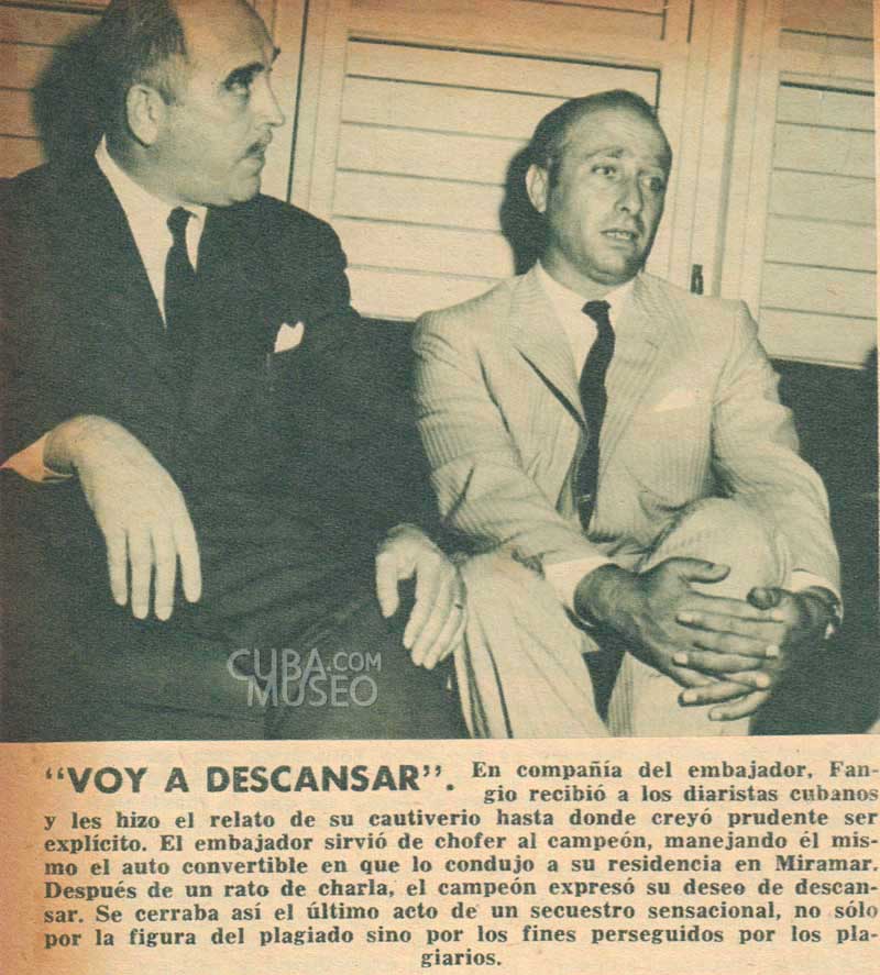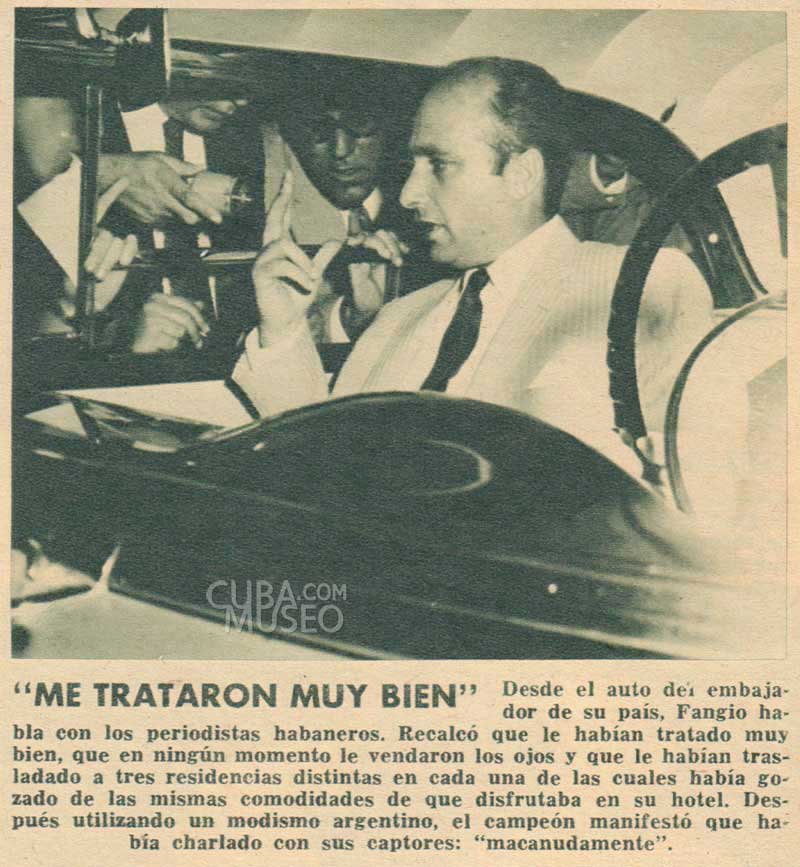 En definitiva todo transcurrió sin contratiempos y Fangio fue entregado al embajador de su país en horas de la tarde del martes 25, horas después de terminada la carrera. Pero se vivieron momentos muy tensos, en que el mundo entero estuvo pendiente de la suerte del famoso corredor. El reportaje en cuestión apareció en el número de Marzo 2 de 1958 de la revista Bohemia, a menos de una semana del hecho. Sus titulares: “Un REPORTAJE en 2 TIEMPOS: El SENSACIONAL SECUESTRO DE JUAN MANUEL FANGIO / AL AIRE SALTABAN CUERPOS HUMANOS”