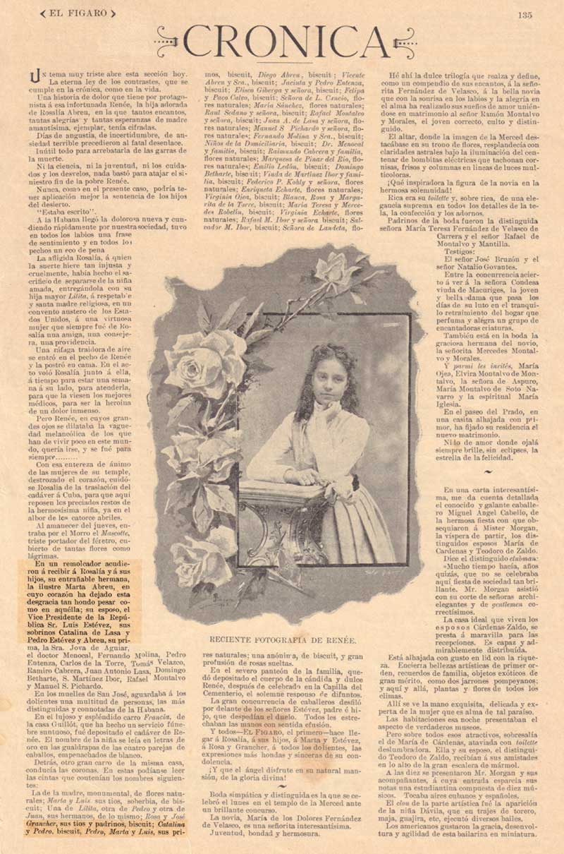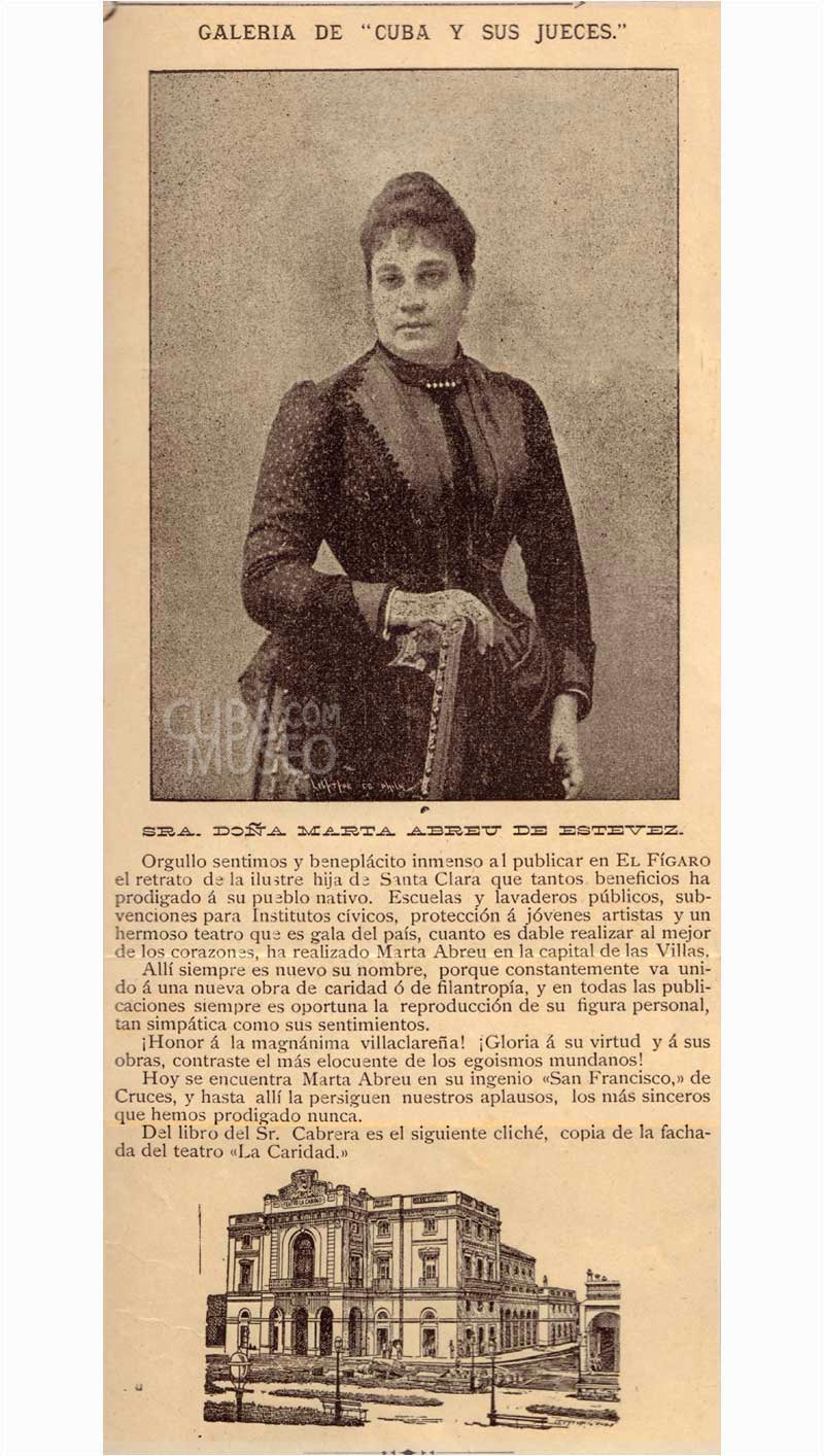 Orgullo sentimos y beneplácito inmenso al publicar en EL FÍGARO el retrato de la ilustre hija de Santa Clara que tantos beneficios ha prodigado á su pueblo nativo. Escuelas y lavaderos públicos, subvenciones para Institutos cívicos, protección á jóvenes artistas y un hermoso teatro que es gala del país, cuanto es dable realizar al mejor de los corazones, ha realizado Marta Abren en la capital de las Villas.