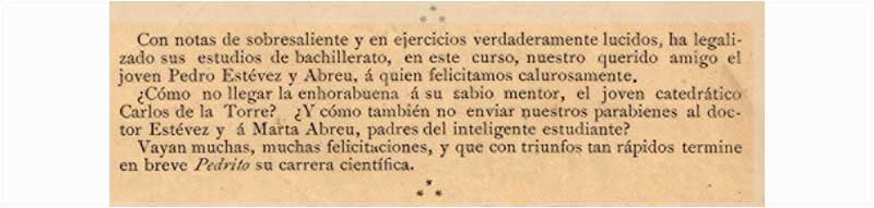 Como vemos Pedrito Estévez, que en esos momentos tendría 17 años se encontraba estudiando con Carlos de la Torre como mentor. Lo describen como… un inteligente estudiante….que en breve terminaría su carrera científica…