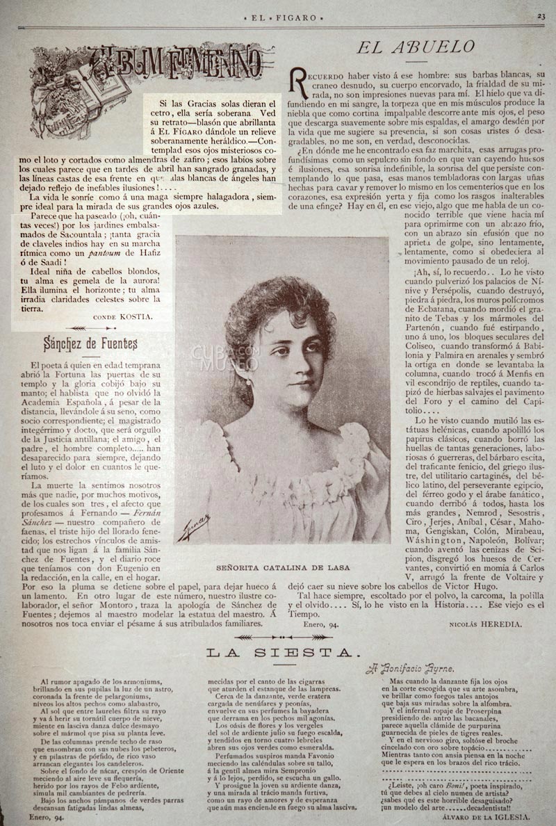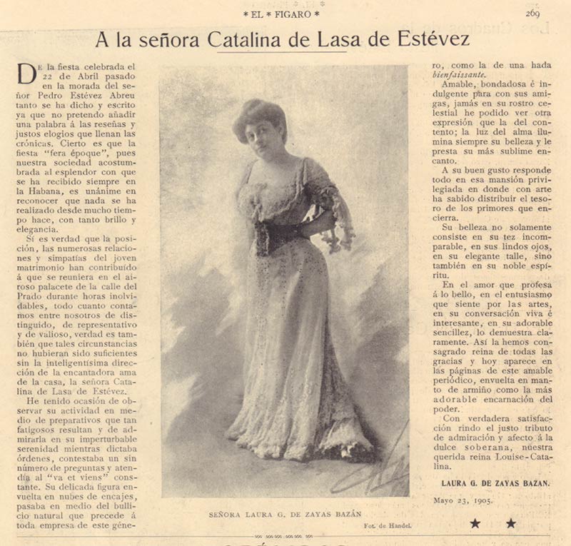 La señora Laura G. De Zayas Bazán, que fue la encargada de montar y dirigir las representaciones (cuadros) que animaron la fiesta, le dedica esta crónica a Catalina. Es la única que veremos en que se alaba algo más que su belleza, en este caso sus dotes de organizadora o anfitriona. Su prosa es más sencilla y fácil de entender que la de Fontanills