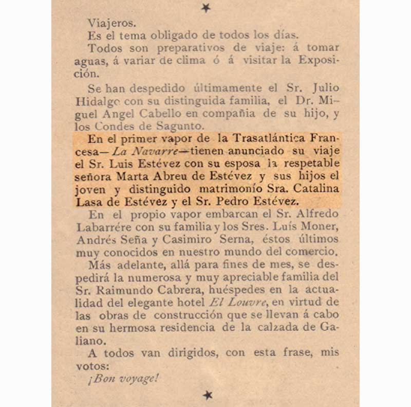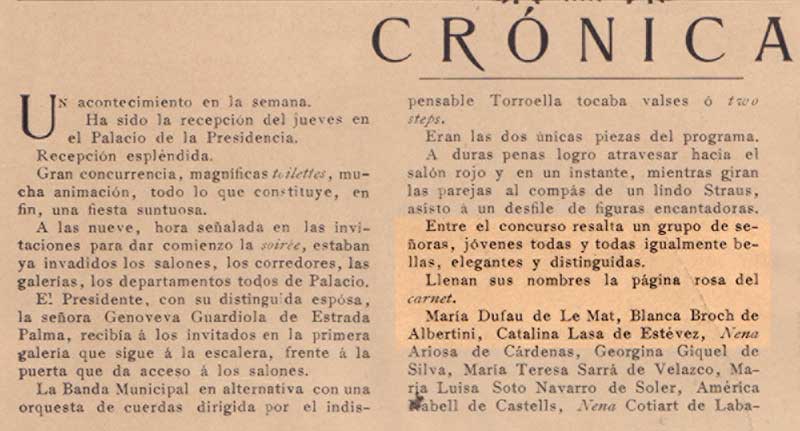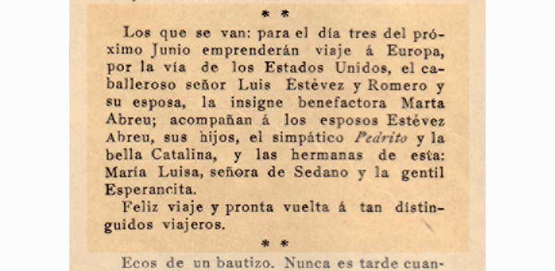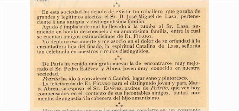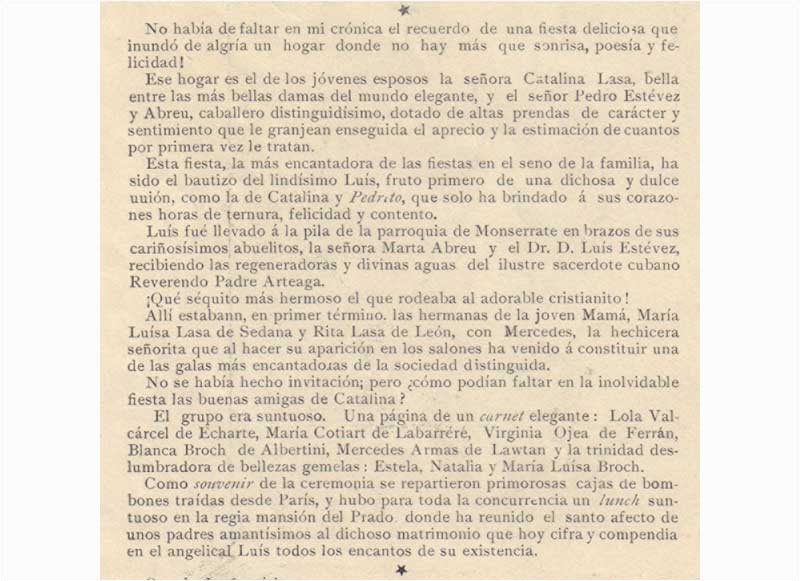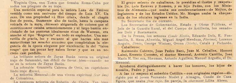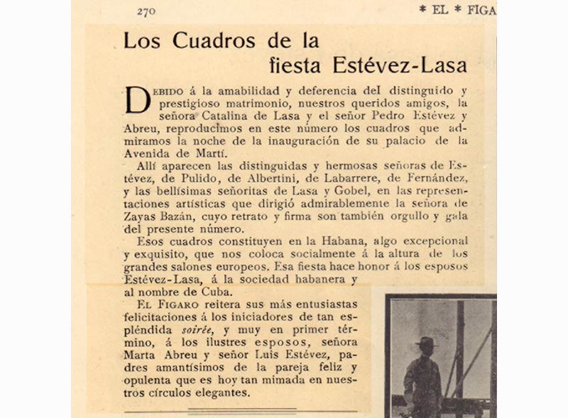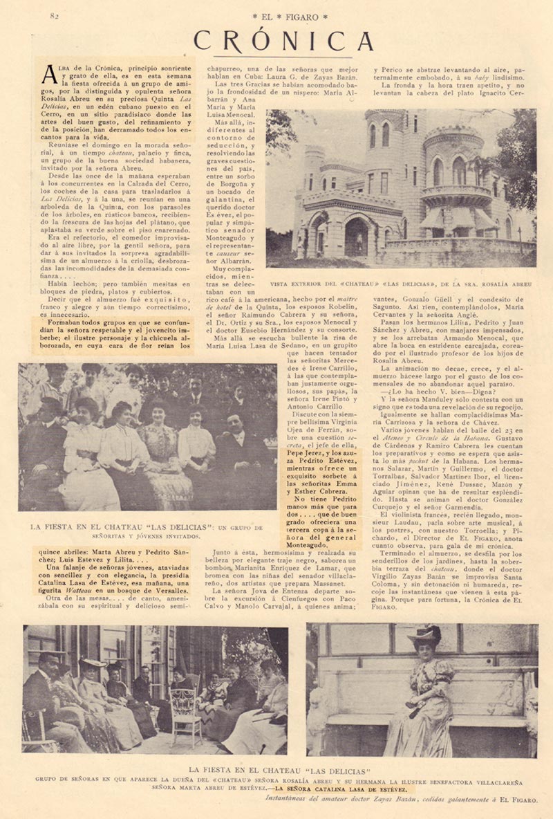 De la fiesta celebrada el 22 «le Abril pasado en la morada del señor Pedro Estévez Abreu tanto se ha dicho y escrito ya que no pretendo añadir una palabra á las reseñas y justos elogios que llenan las crónicas. Cierto es que la fiesta “fera époque”, pues nuestra sociedad acostumbrada al esplendor con que se ha recibido siempre en la Habana, es unánime en reconocer que nada se ha realizado desde mucho tiempo hace, con tanto brillo y elegancia.
