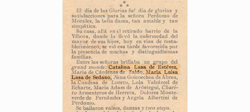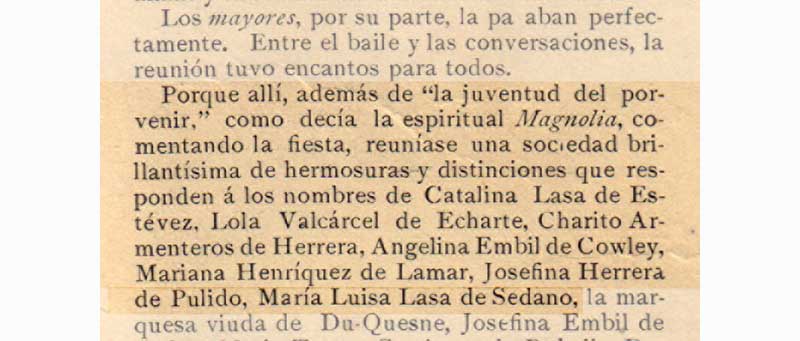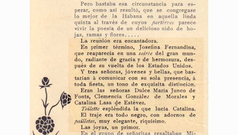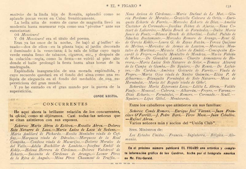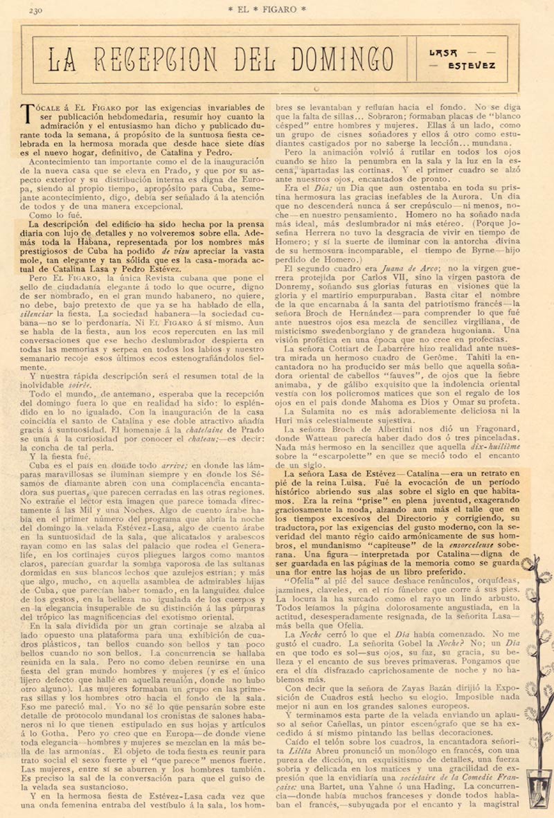 Pero EL FÍGARO, la única Revista cubana que pone el sello de ciudadanía elegante á todo lo que ocurre, digno de ser nombrado, en el gran mundo habanero, no quiere, no debe, bajo pretexto de que ya se ha hablado de ella, silenciar la fiesta. La sociedad habanera la sociedad cubana no se lo perdonaría. Ni EL FIGARO á sí mismo. Aun se habla de la fiesta, aun los ecos repercuten en las mil conversaciones que ese hecho deslumbrador despierta en todas las memorias v serpea en todos los labios y nuestro semanario recoje esos últimos ecos estenografiándolos fielmente.