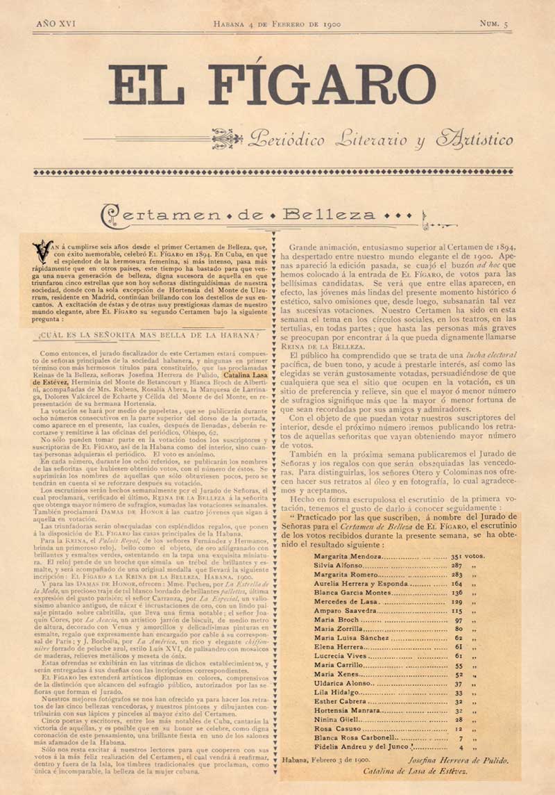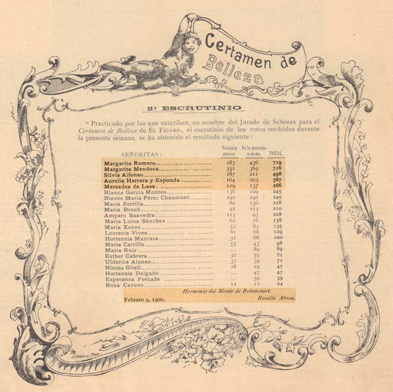 “Practicado por el Jurado de Señoras el escrutinio general del Certamen de Belleza de EL FÍGARO, con vista de los votos recibidos durante la actual semana, se ha obtenido para los cinco primeros lugares que constituyen los premios el siguiente resultado: