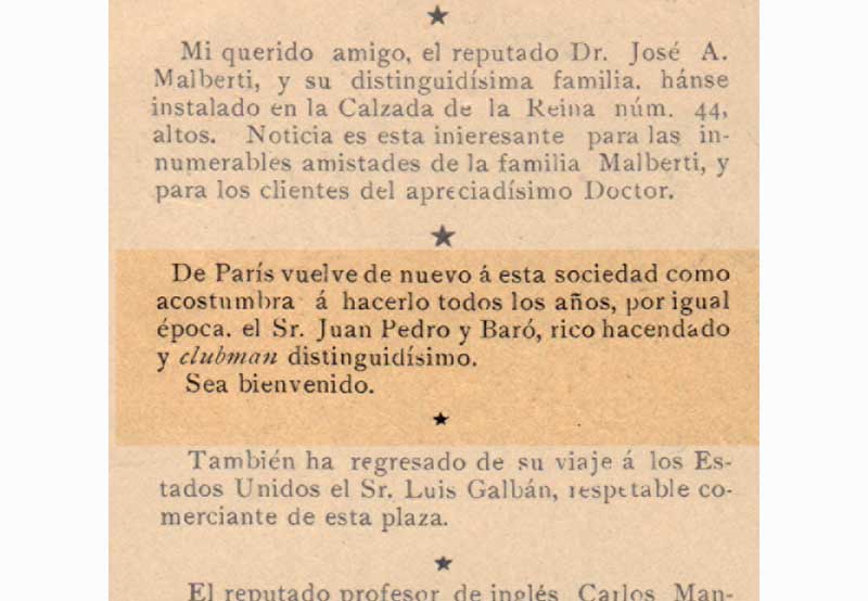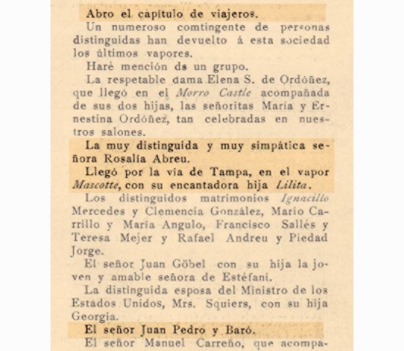 Noviembre 5 - Noticia sobre la llegada de Rosalía Abreu y Pedro Baró… (Imagen en Galería: 1905-11-05)