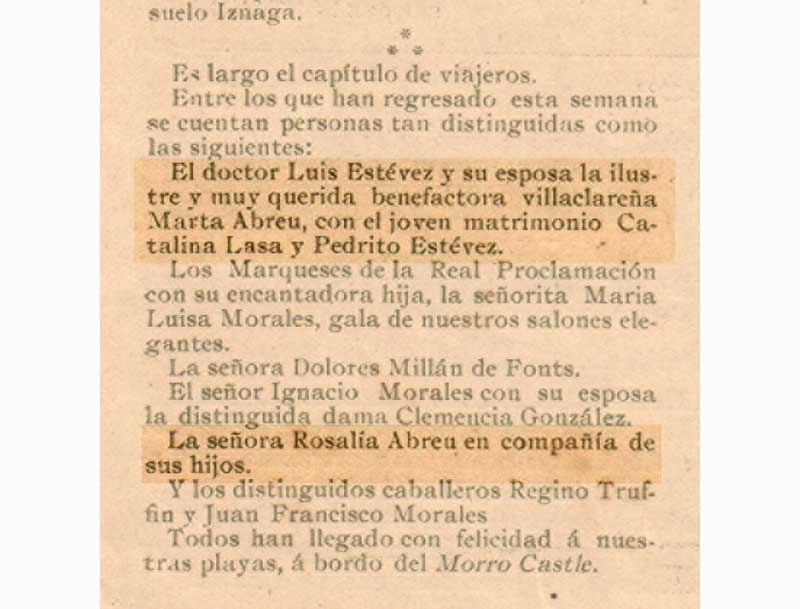 En un remolcador acudieron a recibir a Rosalía y a sus hijos, su entrañable hermana, la ilustre Marta Abren, en cuyo corazón ha dejado esta desgracia tan hondo pesar como en aquélla; su esposo, el Vice Presidente de la República Sr. Luis Estévez, sus sobrinos Catalina de Lasa y Pedro Estévez y Abreu, su prima, la Sra. Jova de Aguiar…..