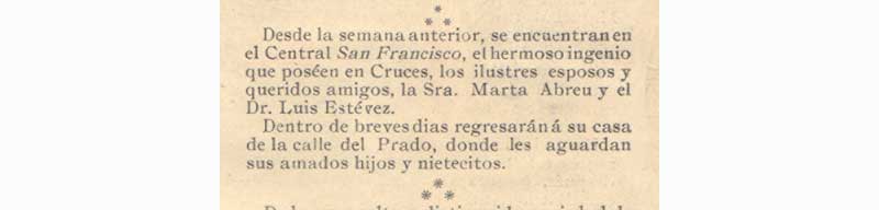 Hoy se encuentra Marta Abreu en su ingenio «San Francisco,» de Cruces, y hasta allí la persiguen nuestros aplausos, los más sinceros que hemos prodigado nunca.