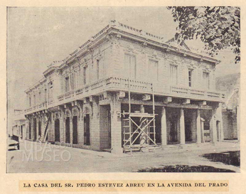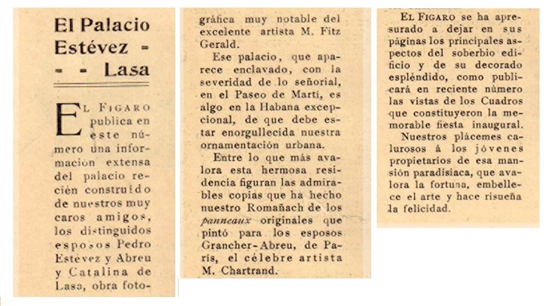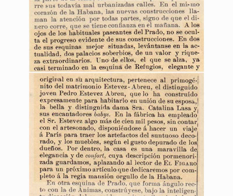 En el misino corazón de la Habana, las nuevas construcciones llaman la atención por todas partes, signo de que el dinero corre, que se tiene confianza en el mañana. A los ojos de los habituales paseantes del Prado, no se oculta el progreso evidente de sus construcciones. En dos de sus esquinas mejor situadas, levántanse en la actualidad dos palacios soberbios, de un valor y riqueza extraordinarios. Uno de ellos, el que se alza, ya casi terminado en la esquina de Refugios, elegante y original en su arquitectura, pertenece al primogénito del matrimonio Estévez- Abreu, el distinguido joven Pedro Estévez Abreu, que lo ha construido expresamente para habitarlo en unión de su esposa, la bella y distinguida dama Sra. Catalina Lasa y sus encantadores babys. En la fábrica ha empleado el Sr. Estévez algo más de cien mil pesos, sin contar con el artesonato, disponiéndose á hacer un viaje á París para traer los artefactos del suntuoso decorado, y los muebles, según el gusto depurado de los, dueños. Por dentro, la casa es una maravilla de elegancia y de confort, cuya descripción pormenorizada guardamos, aplazando al lector de EL FÍGARO para un próximo artículo que dedicaremos por completo á la regia mansión orgullo dé la Habana.
