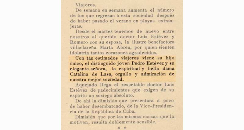 Revisando esta transcripción nos tomaremos la libertad de hacer algunos comentarios necesarios para entender a plenitud esta historia. Son necesarios porque Marta Abreu fue la suegra de Catalina. Vemos aquí como ya en 1891 era ella un personaje descollante dentro de la burguesía criolla. La guerra del 95 la pasó en Paris desde donde ayudó con grandes sumas a la causa independentista. Una vez terminada la guerra el prestigio de Marta Abreu era tal que puede ser considerada la mujer más influyente de Cuba a inicios de la república. A ello contribuyó también su esposo Luis Estévez, abogado de extracción pobre pero de conducta intachable y patriótica lo que lo llevo a ser elegido vicepresidente de la república. Cuando analizamos la vida de esta pareja, sus principios y su estrecha relación - a la muerte de Marta en 1909 Luis no pudo resistirlo y se suicidó días después - nos imaginamos lo que deben haber sufrido cuando la madre de sus tres nietos traicionó a su único hijo con el Sr. Baró.