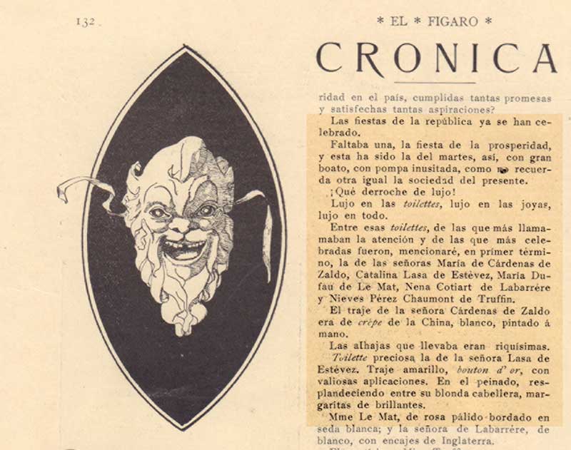 Algo que debíamos haber aclarado antes es que en las transcripciones hemos respetando el estilo y la ortografía originales. En ellas abundan las palabras rebuscadas o en idioma francés, las alusiones a personajes célebres, etc., recurso muy usado por los cronistas de la época en busca de impresionar a la naciente burguesía nacional. No importaba que se quedaran sin entender, mejor así, más refinados los considerarían.