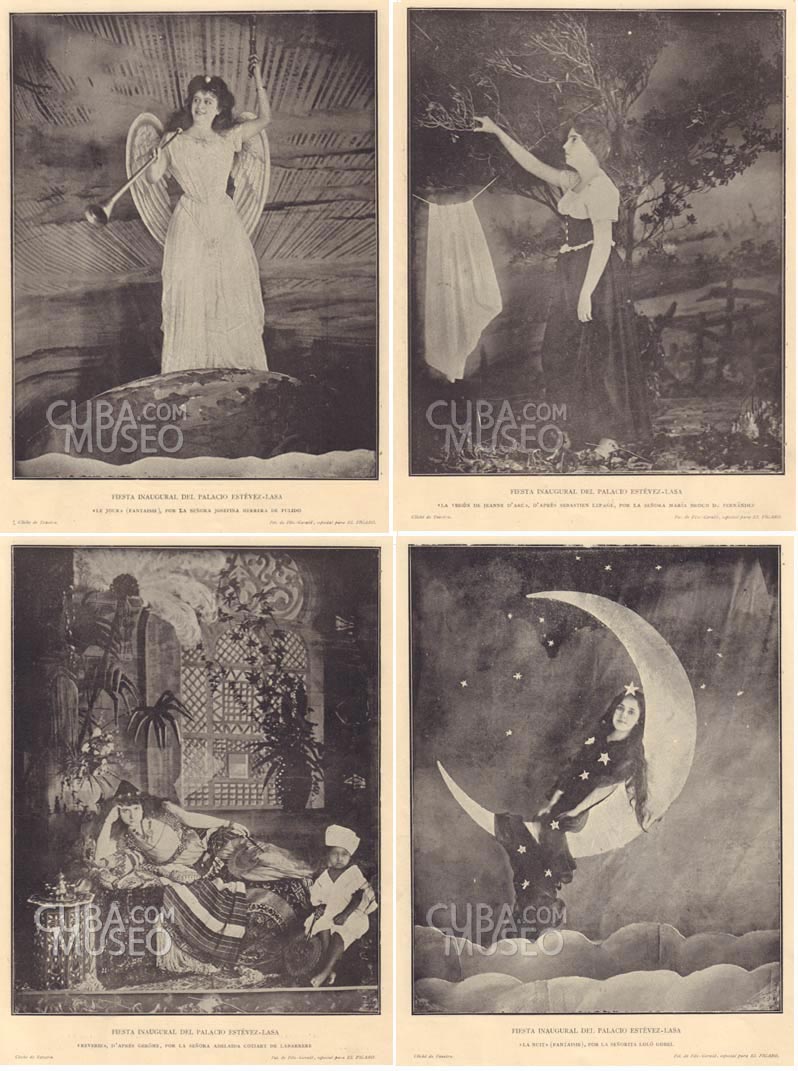 Estas representaciones de personajes famosos realizadas por bellas damas, llamadas cuadros, copiaban una costumbre de la alta sociedad europea de la época. Fueron varias las preparadas para la ocasión. Cada una apareció a página completa en la revista. A continuación tras una corta reseña con los nombres de las damas participantes las veremos agrupadas en una sola imagen.
