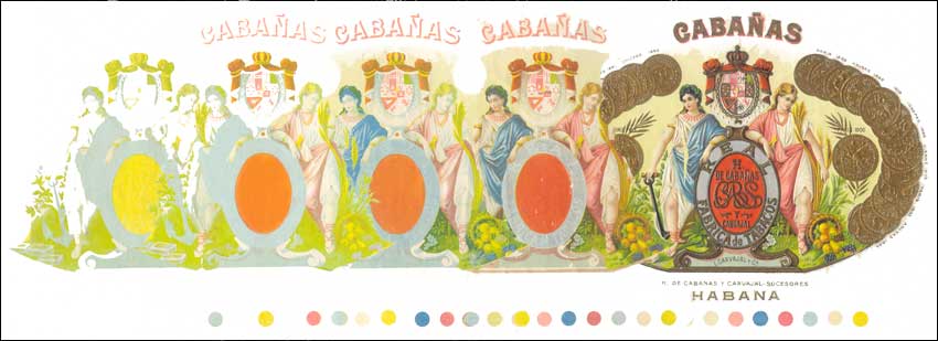 Un ejemplo magnifico para llegar a comprender lo trabajoso del proceso de fabricación de una habilitación tabacalera es este raro juego de 12 piezas que constituyen la llamada “prueba progresiva” de la vista principal de la conocida marca Cabañas, una de las mas importantes y antiguas de Cuba.